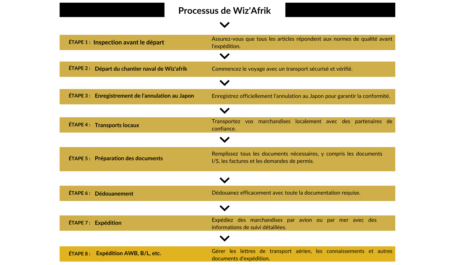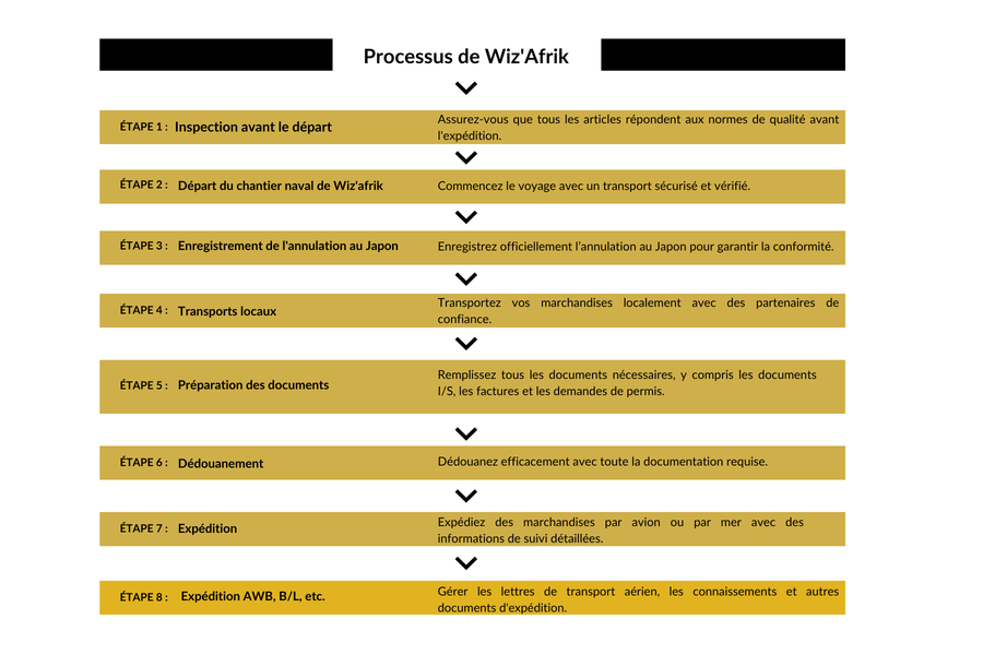 Notre nouvelle société d'import-export, Wiz'Afrik, est ravie d'annoncer notre expansion sur le marché africain. En mettant l’accent sur l’exportation d’équipements et de produits de haute qualité fabriqués au Japon, nous visons à fournir une variété de services pour répondre aux besoins de nos clients. De la vente d'articles individuels en ligne à l'offre d'options de vente en gros pour les détaillants, nous nous engageons à fournir un service et des produits de premier ordre à nos clients. De plus, nous avons un représentant au Sénégal et un entrepôt où les clients peuvent visiter et voir nos produits en personne.
